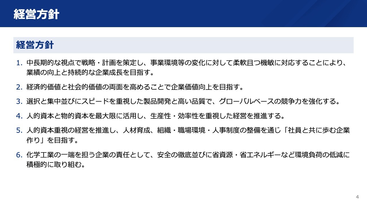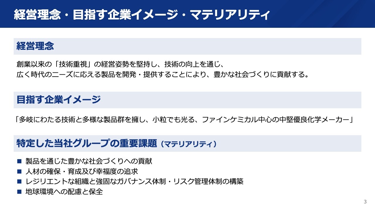 目指す企業イメージは、「多岐にわたる技術と多様な製品群を擁し、小粒でも光る、ファインケミカル中心の中堅優良化学メーカー」です。