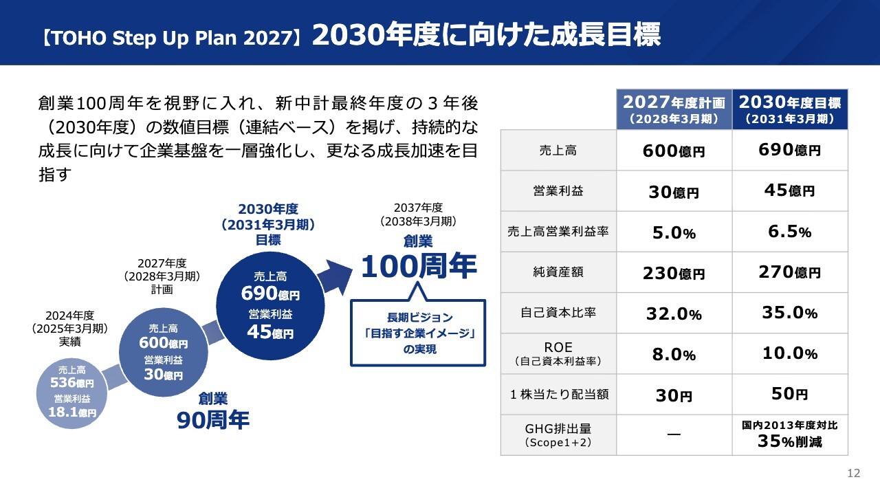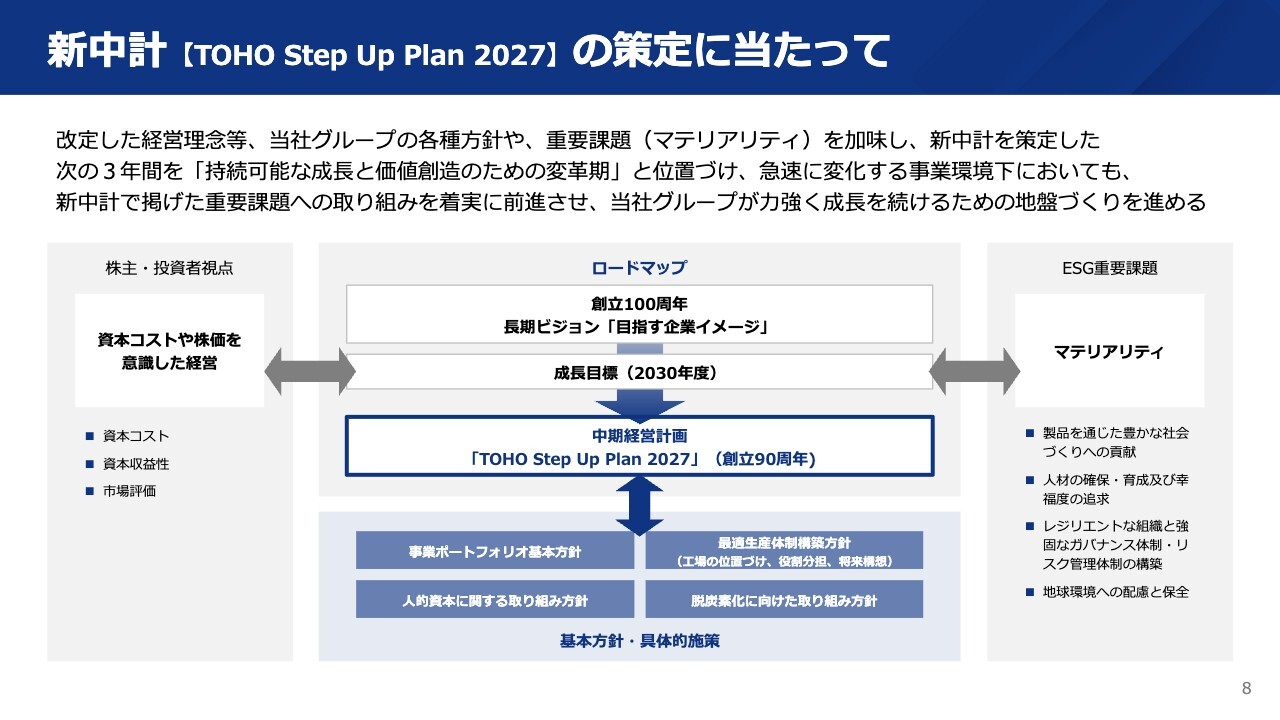 スライド中央のロードマップでは、当社グループの成長ストーリーを整理しています。新中計「TOHO Step Up Plan 2027」(創立90周年)に加え、さらに次の3年後の2030年度の目標も掲げています。足もとの計画や課題を確実に達成して実績を積み上げることで、創立100周年に向けた長期ビジョン「目指す企業イメージ」に近づけるべく取り組んでいきます。