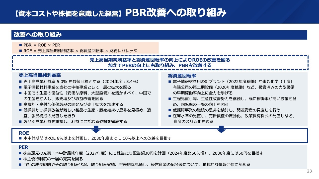 まず、売上高に対する利益率ですが、本中計期間で売上高営業利益率5.0パーセントを計画し、2030年度には6.5パーセントへの改善を目指しています。利益率改善に向け、電子情報材料事業の拡大、中国での生産優位性を活かしたコスト競争力強化、高機能・高付加価値製品の開発などを進めます。また、低採算製品の見直しを行い、利益重視の経営を徹底します。