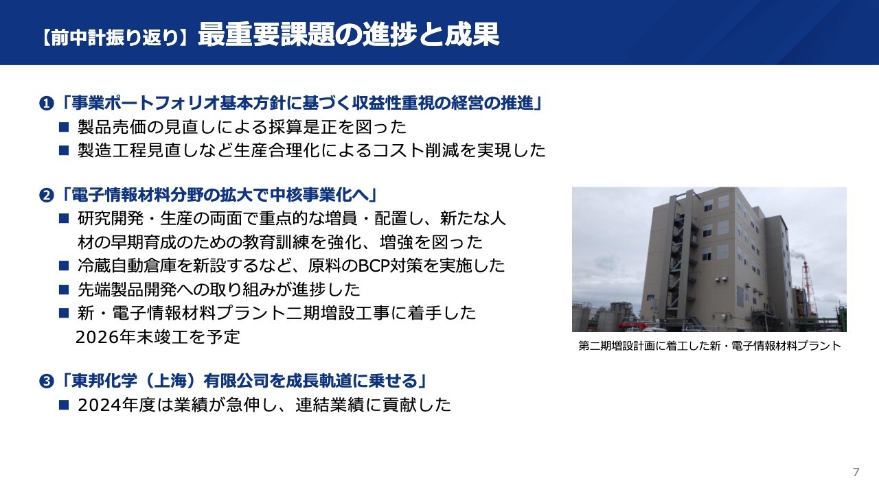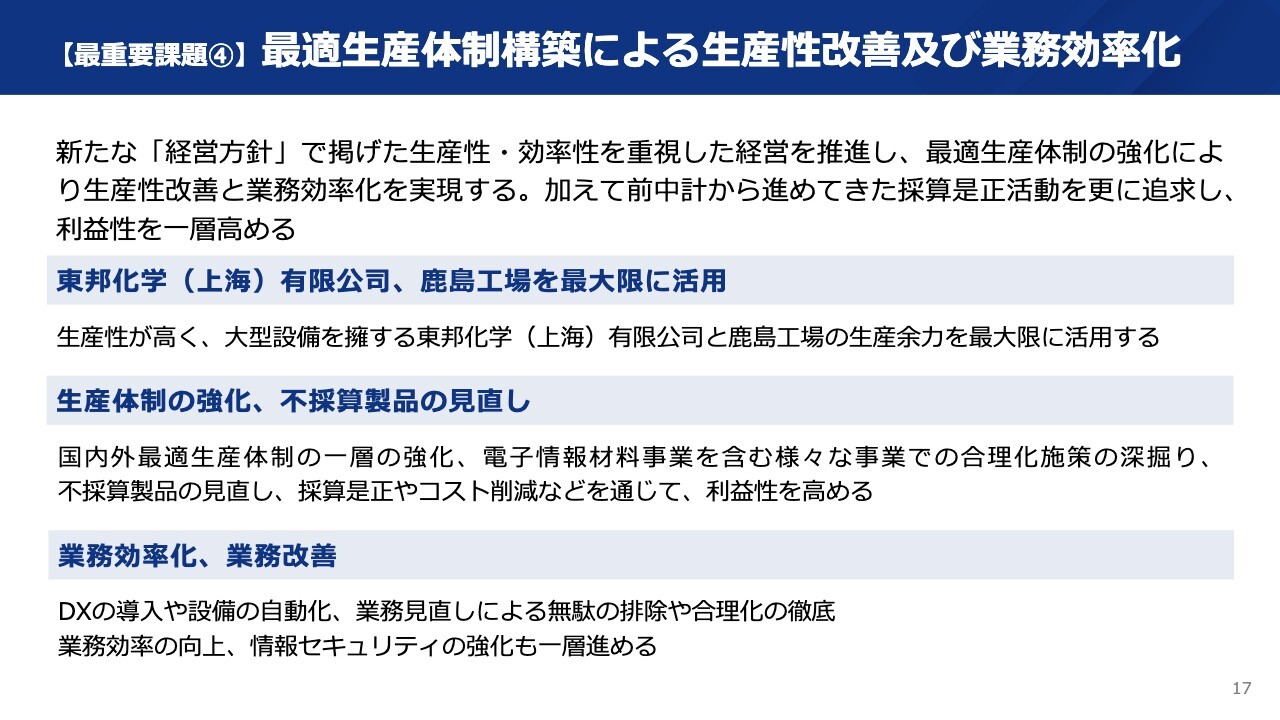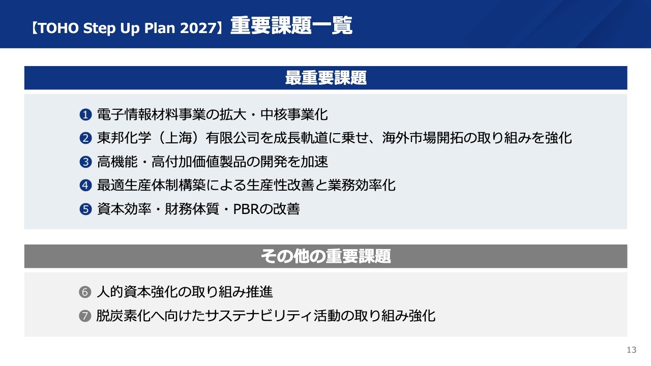 最重要課題の1つ目は電子情報材料事業の拡大・中核事業化、2つ目は東邦化学(上海)有限公司を成長軌道に乗せ、海外市場開拓の取り組みを強化すること、3つ目は高機能・高付加価値製品の開発の加速、4つ目は最適生産体制構築による生産性改善と業務効率化、5つ目は資本効率・財務体質・PBRの改善です。
