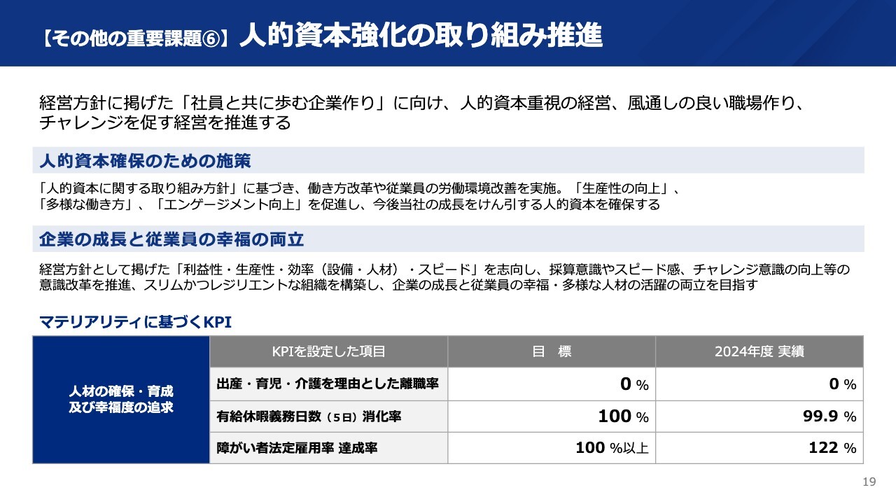重要課題の6つ目である人的資本強化の取り組み推進についてご説明します。当社は、経営方針に掲げた「社員と共に歩む企業作り」の実現に向け、人的資本重視の経営を推進します。風通しの良い職場作りとチャレンジを促す経営を通じて、従業員一人ひとりが力を発揮できる環境を整備していきます。