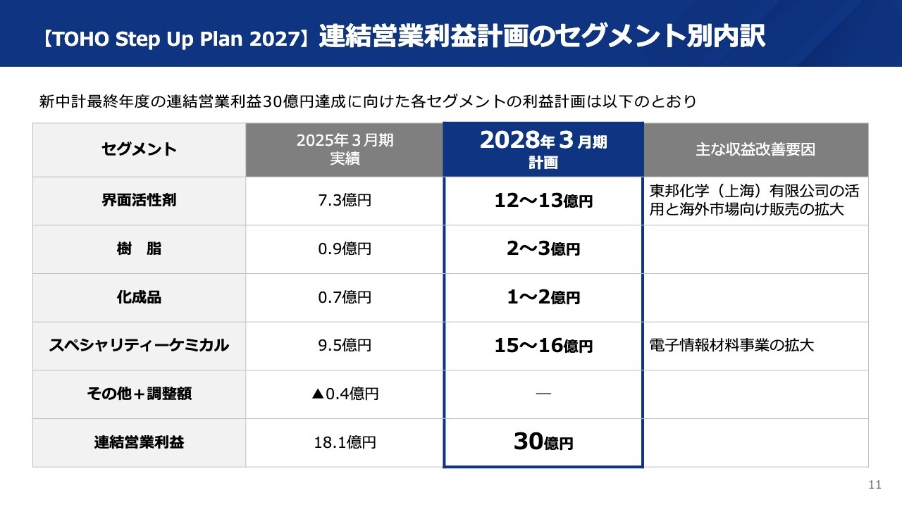 界面活性剤セグメントは、東邦化学(上海)有限公司の活用と海外市場向け販売の拡大により、2024年度(2025年3月期)実績の7億3,000万円から、2027年度(2028年3月期)は12億円から13億円の水準を計画しています。