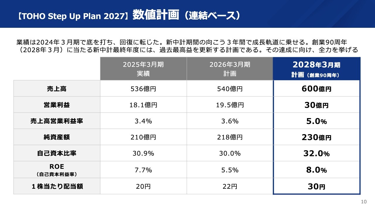 創業90周年にあたる中計最終年度の2027年度(2028年3月期)は、売上高600億円、営業利益30億円、売上高営業利益率5.0パーセント、純資産額230億円、自己資本比率32.0パーセント、ROE8.0パーセント、1株当たり配当額30円を計画しています。