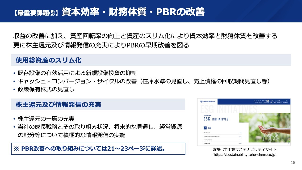 最重要課題の5つ目である資本効率・財務体質・PBRの改善についてご説明します。収益改善に加え、資産回転率の向上と資産のスリム化により、資本効率と財務体質を改善します。さらに、株主還元と情報発信の充実によって、PBRの早期改善を図ります。