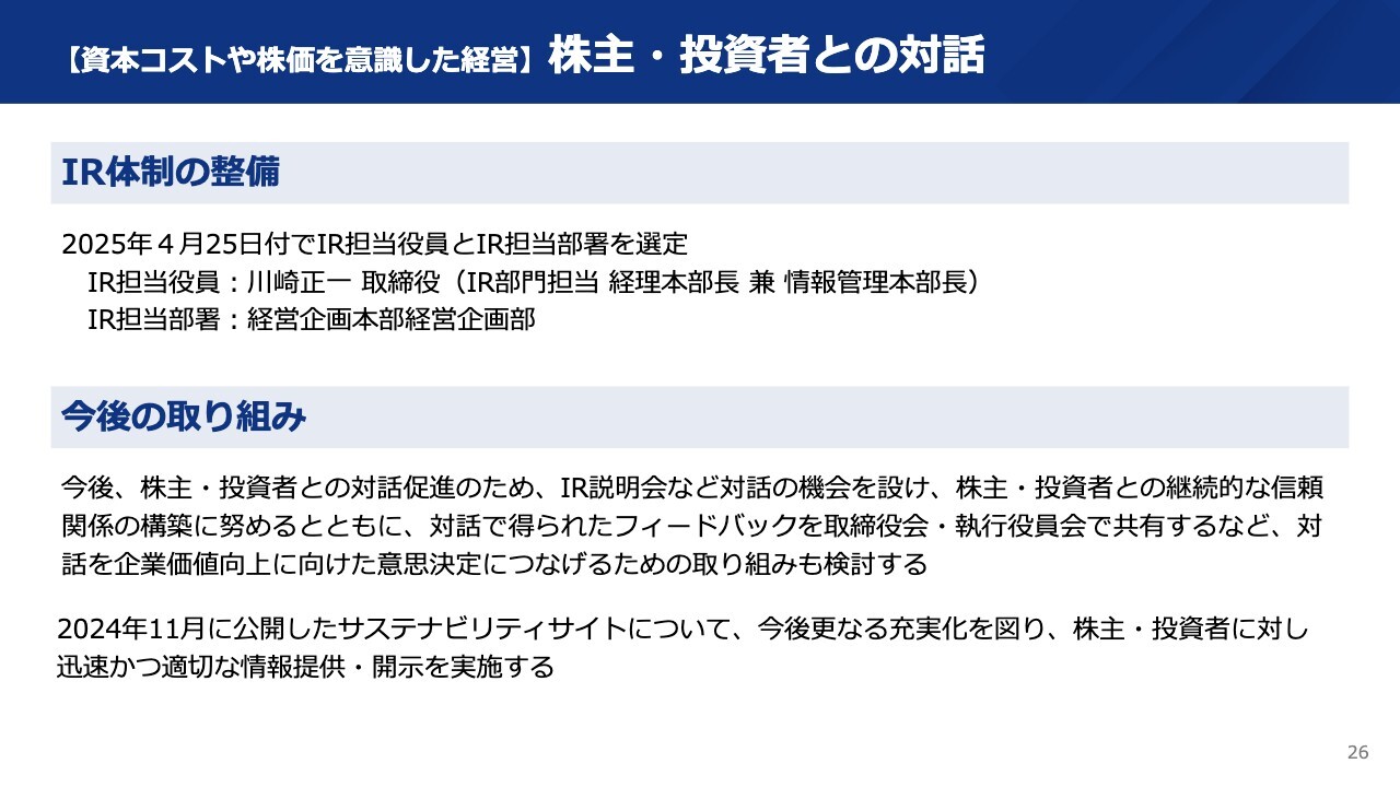 最後に、株主・投資者との対話についてご説明します。2025年4月25日付で、IR担当役員及びIR担当部署を新たに選定しました。IR担当役員は、取締役の川崎正一(経理本部長兼情報管理本部長)、IR担当部署は、経営企画本部経営企画部となります。