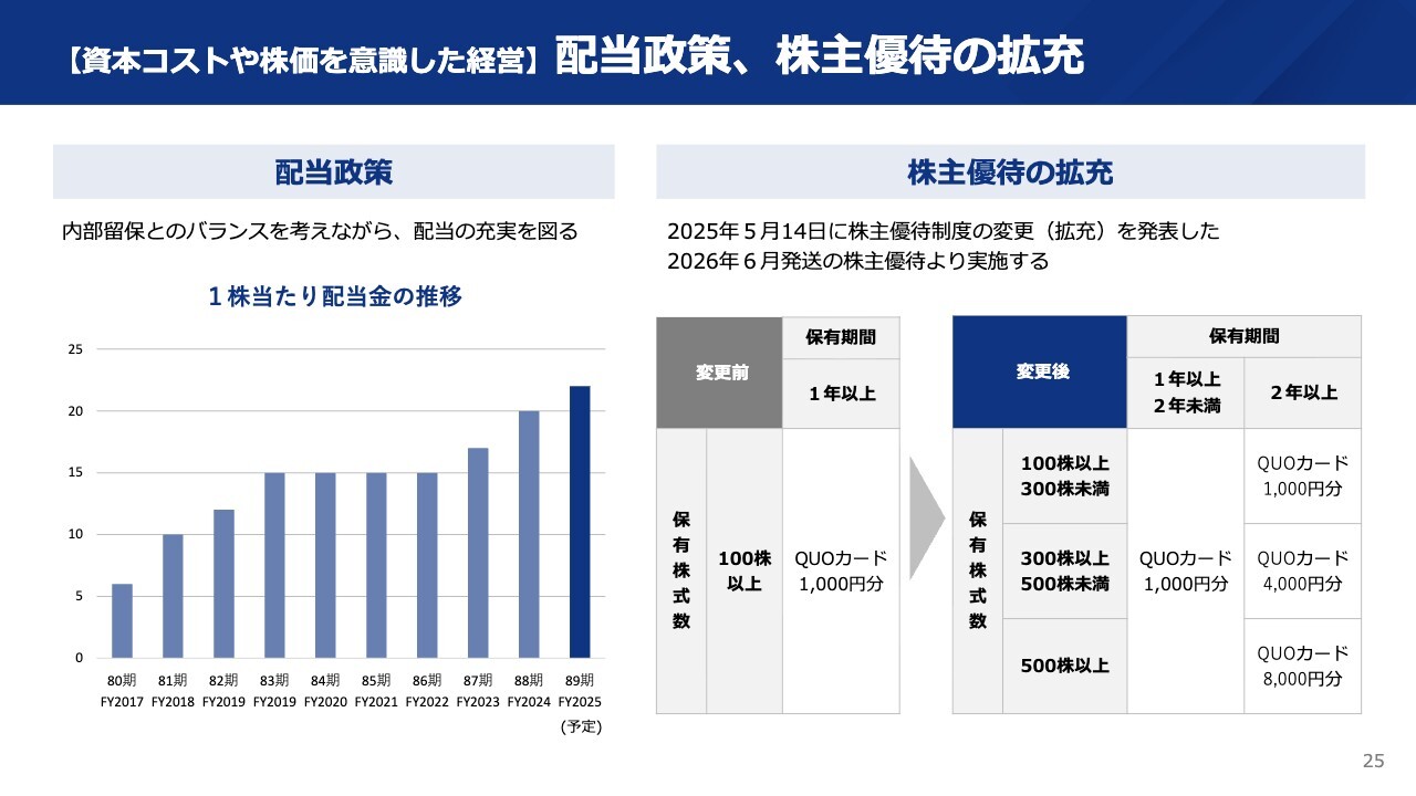 また、2025年5月14日に株主優待制度の変更(拡充)を発表しました。2026年6月発送分から新制度を実施します。変更後は、保有株式数及び保有期間に応じて「QUOカード」の金額を増額します。保有期間1年以上2年未満は「QUOカード」1,000円分、保有期間2年以上で、100株以上300株未満は1,000円分、300株以上500株未満は4,000円分、500株以上は8,000円分を進呈します。今後も株主のみなさまへの還元のさらなる充実を図っていきます。