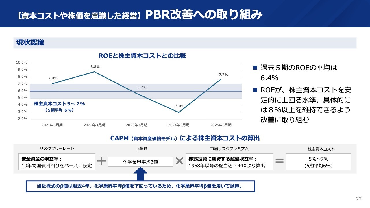 資本資産価格モデル(CAPM)による試算では、化学業界平均のβ値を用いて算出した株主資本コストは、おおむね5パーセントから7パーセント(5期平均6パーセント)の範囲となっています。