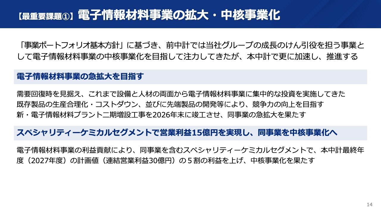 最重要課題の1つ目である電子情報材料事業の拡大と中核事業化についてご説明します。