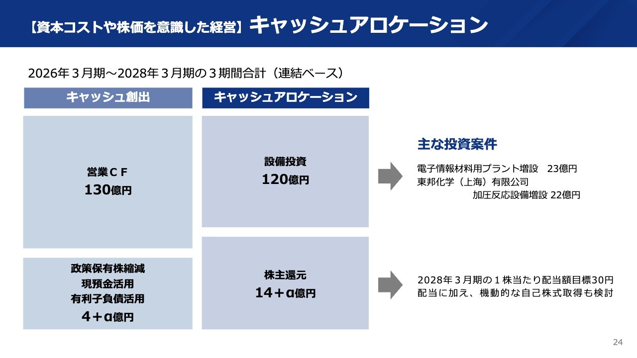 キャッシュアロケーションについてご説明します。スライドには、2025年度(2026年3月期)から2027年度(2028年3月期)までの3年間におけるキャッシュ創出と配分計画を示しています。営業キャッシュフローは130億円、政策保有株式の縮減と現預金や有利子負債活用で4億円プラスアルファを見込んでおり、創出したキャッシュは設備投資に120億円、株主還元に14億円プラスアルファを充当する計画です。