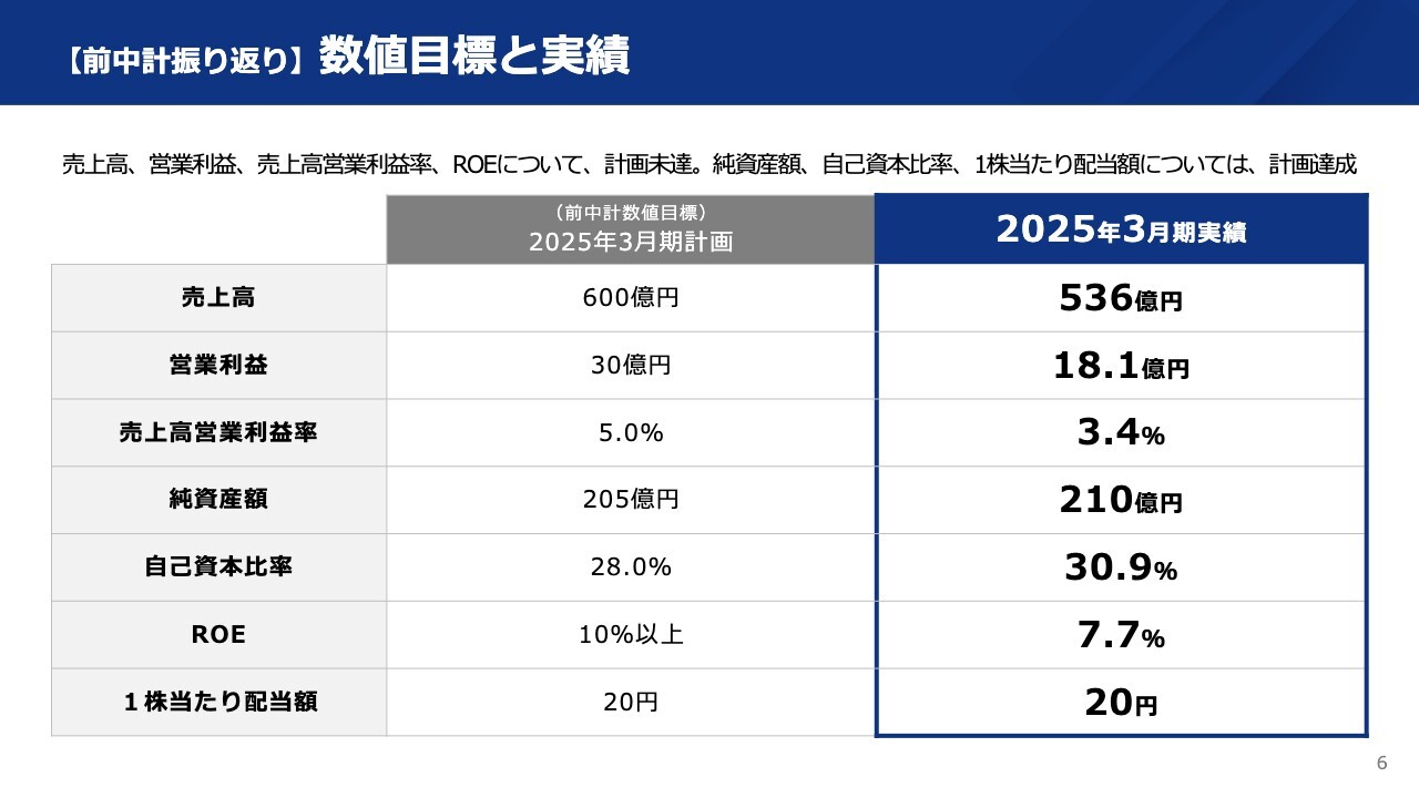 前中計の数値目標と実績です。2024年度(2025年3月期)の計画値と実績値を比較すると、売上高は600億円の計画に対して実績は536億円、営業利益は30億円の計画に対して実績は18億1,000万円、売上高営業利益率は5.0パーセントの計画に対して実績は3.4パーセント、ROEは10パーセントの計画に対して実績は7.7パーセントと計画未達となりました。