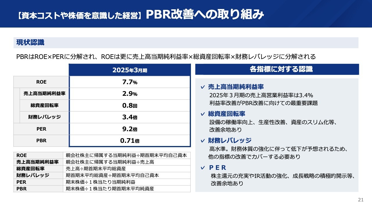 各指標に対する認識として、2025年3月期の売上高営業利益率は3.4パーセントであり、PBR改善に向けては、利益率改善が最重要課題と考えています。総資産回転率については、設備稼働率の向上や生産性の改善、資産スリム化などによる改善余地があります。