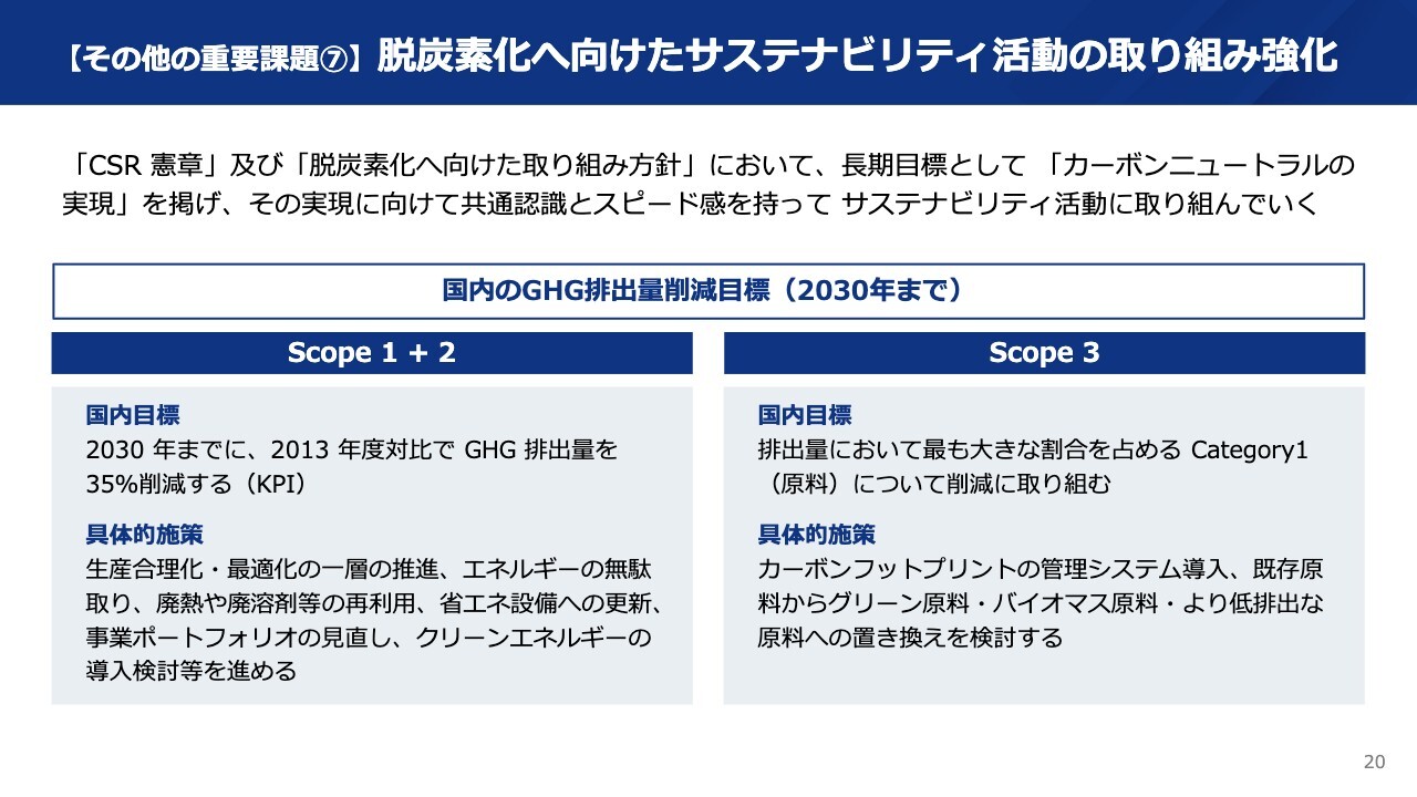 その他の重要課題ですが、6つ目は人的資本強化の取り組み推進、7つ目は脱炭素化に向けたサステナビリティ活動の取り組み強化です。