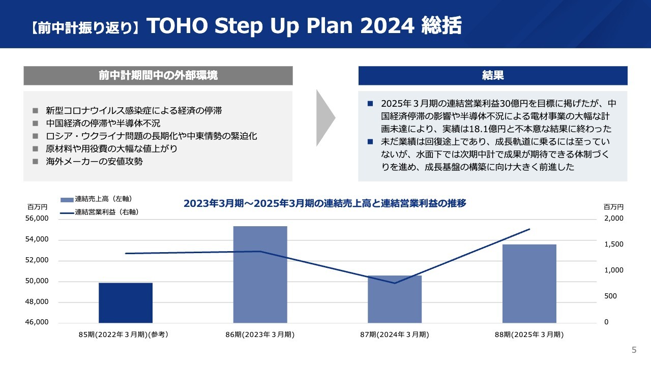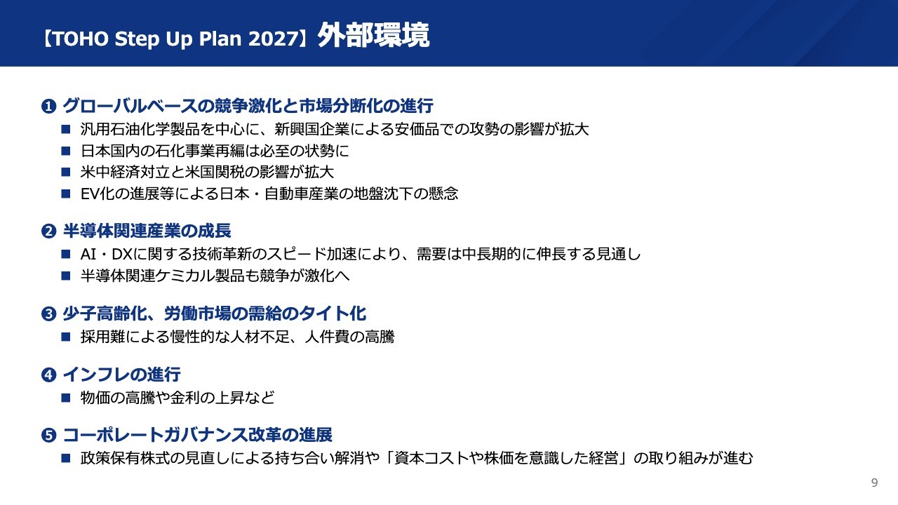 まず、前中計期間中の外部環境についてです。新型コロナウイルス感染症による経済の停滞、中国経済の減速や半導体不況、さらにロシア・ウクライナ戦争の長期化や中東情勢の緊迫化など、極めて厳しい環境下での事業運営となりました。また、原材料や用役費が大幅に値上がりし、海外メーカーによる安値攻勢も激しくなりました。