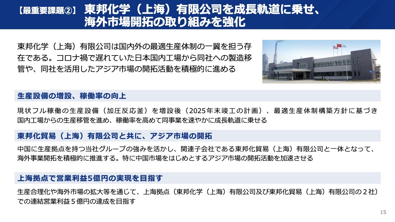 最重要課題の2つ目である東邦化学(上海)有限公司を成長軌道に乗せる取り組みと海外市場開拓の強化についてご説明します。東邦化学(上海)有限公司は、国内外の最適生産体制の一翼を担う重要な拠点です。コロナ禍で遅れていた国内工場からの製造移管を進めるとともに、同社を活用したアジア市場の開拓活動を積極的に推進します。