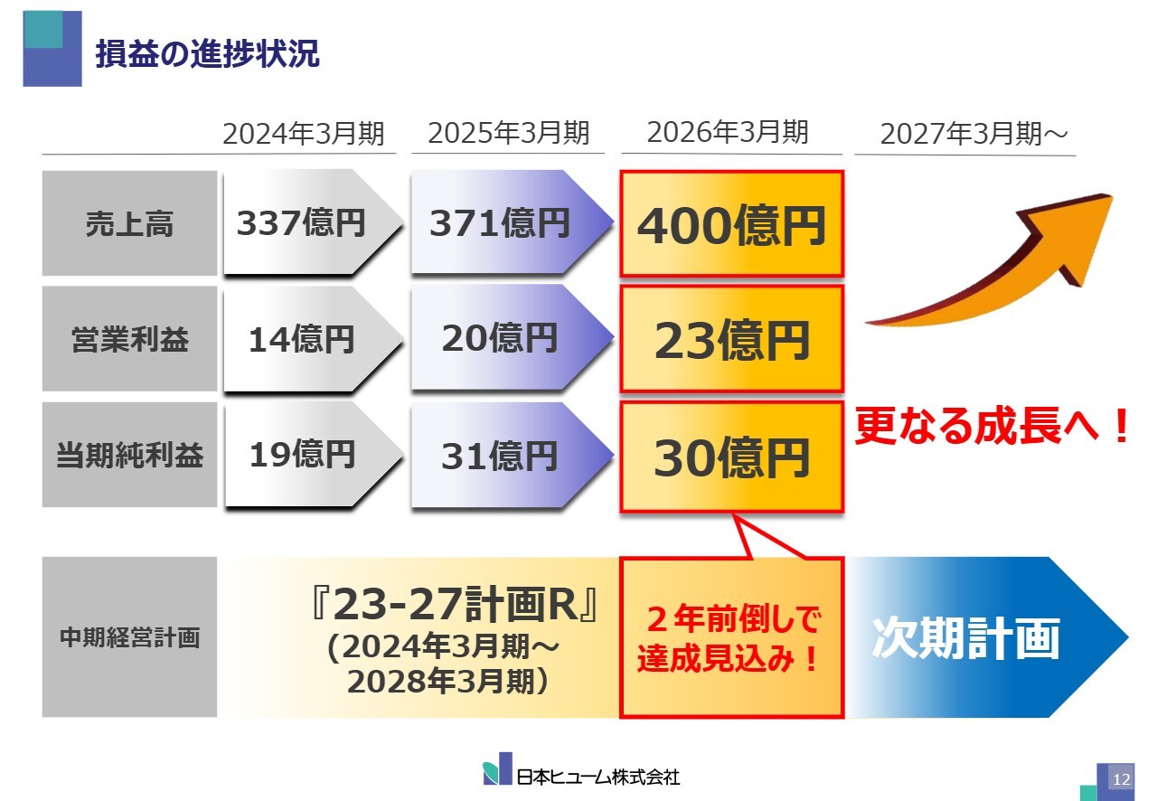 最終年度である2027年に、売上高400億円、営業利益22億円の達成を目標としてきましたが、2年前倒しで達成する見通しです。足元の受注動向や採算性改善の進展を踏まえ、このたび通期業績予想を上方修正しました。