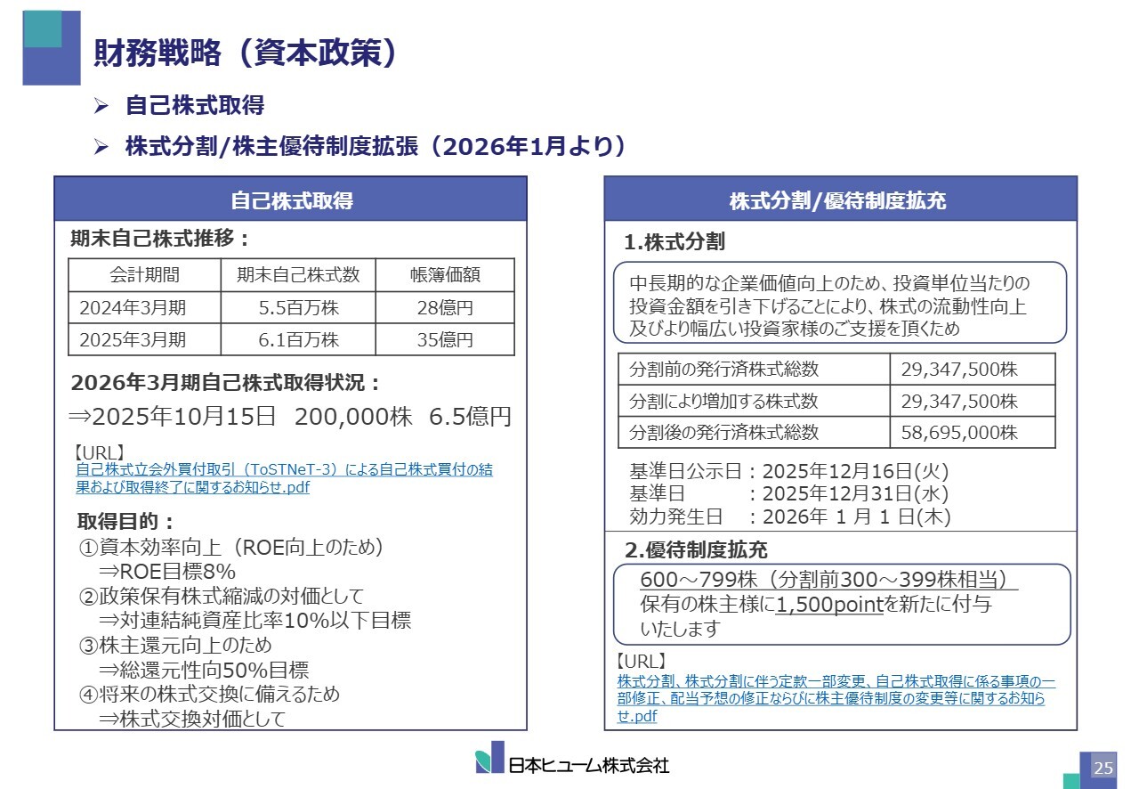 まず、自己株式の取得についてです。財務状況や株式市場の動向などを総合的に勘案し、今年10月15日に20万株、約6億5,000万円の自己株式を取得しました。これは、資本効率の向上、ROE目標8パーセントの実現、政策保有株式の縮減対応を目的としたものです。