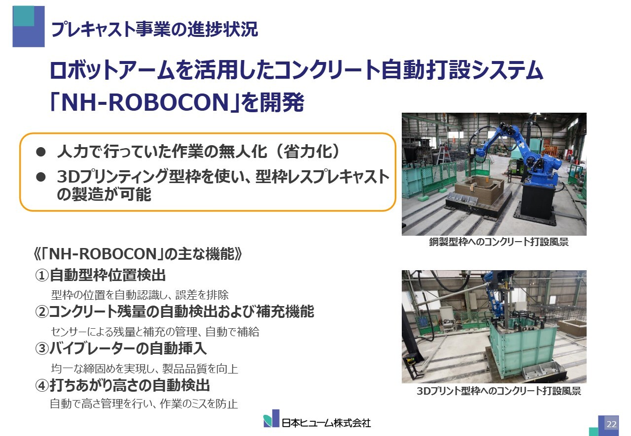2025年10月20日に発表したとおり、当社はロボットアームを活用したコンクリートの自動打設システム「NH-ROBOCON」を開発しました。これまで複数名の熟練工が行っていたコンクリート打設や、振動を加える作業である加振作業が、スタートボタンひとつで自動的に完了する仕組みです。この取り組みにより、省人化と生産性の大幅な向上を実現しました。