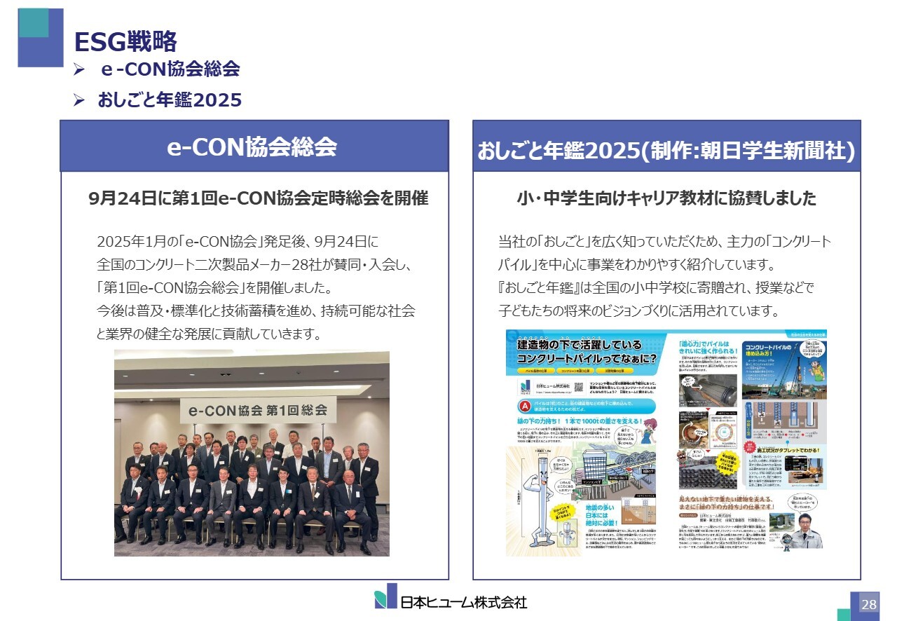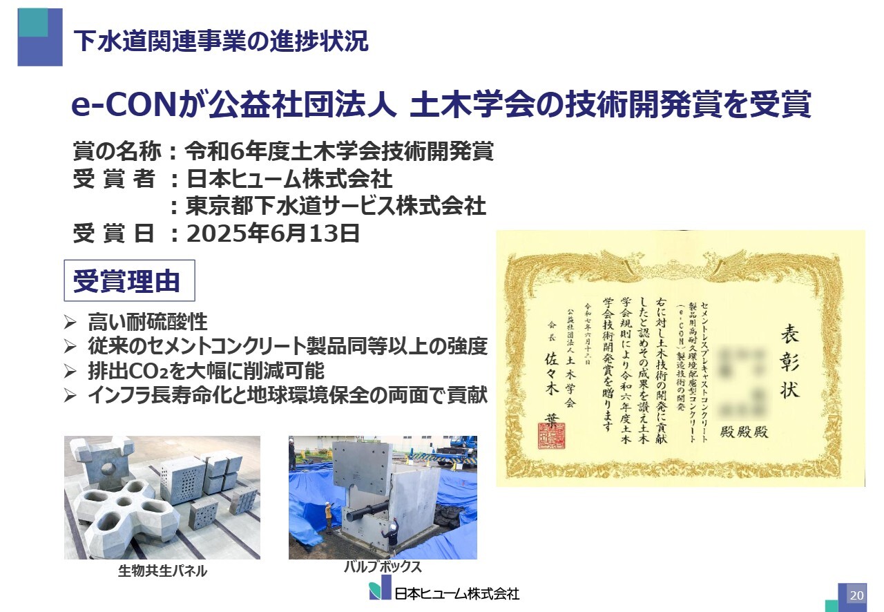 今後は、社会課題となっている下水道管の老朽化対策需要を確実に取り込み、低炭素型高機能コンクリート「e-CON」や、コンクリートの腐食を抑制する「ビックリート」などの製品の拡販を強化していきたいと考えています。