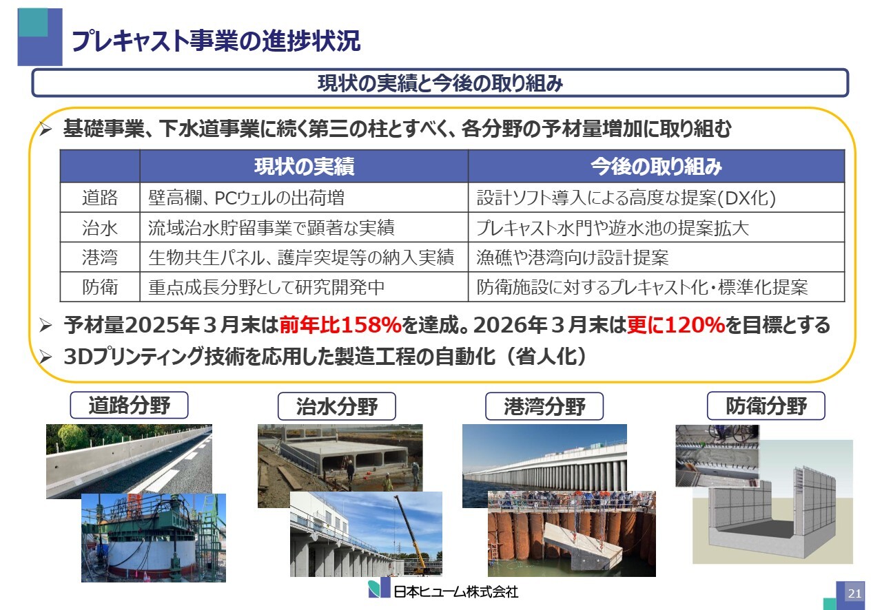 2025年3月期にはプレキャストの予材量が前期比158パーセントと大きく伸長しました。2026年3月期にはさらに前期比120パーセントを目標として、さらなる成長を目指します。