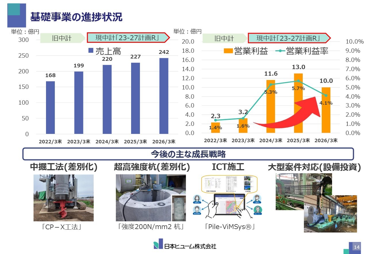 基礎事業については、昨年度に施工した大型杭工事の反動はあるものの、一般土木や再開発関連の案件を中心に受注が堅調に推移しているため、売上高は242億円、前期比6.5パーセント増と、増収を見込んでいます。