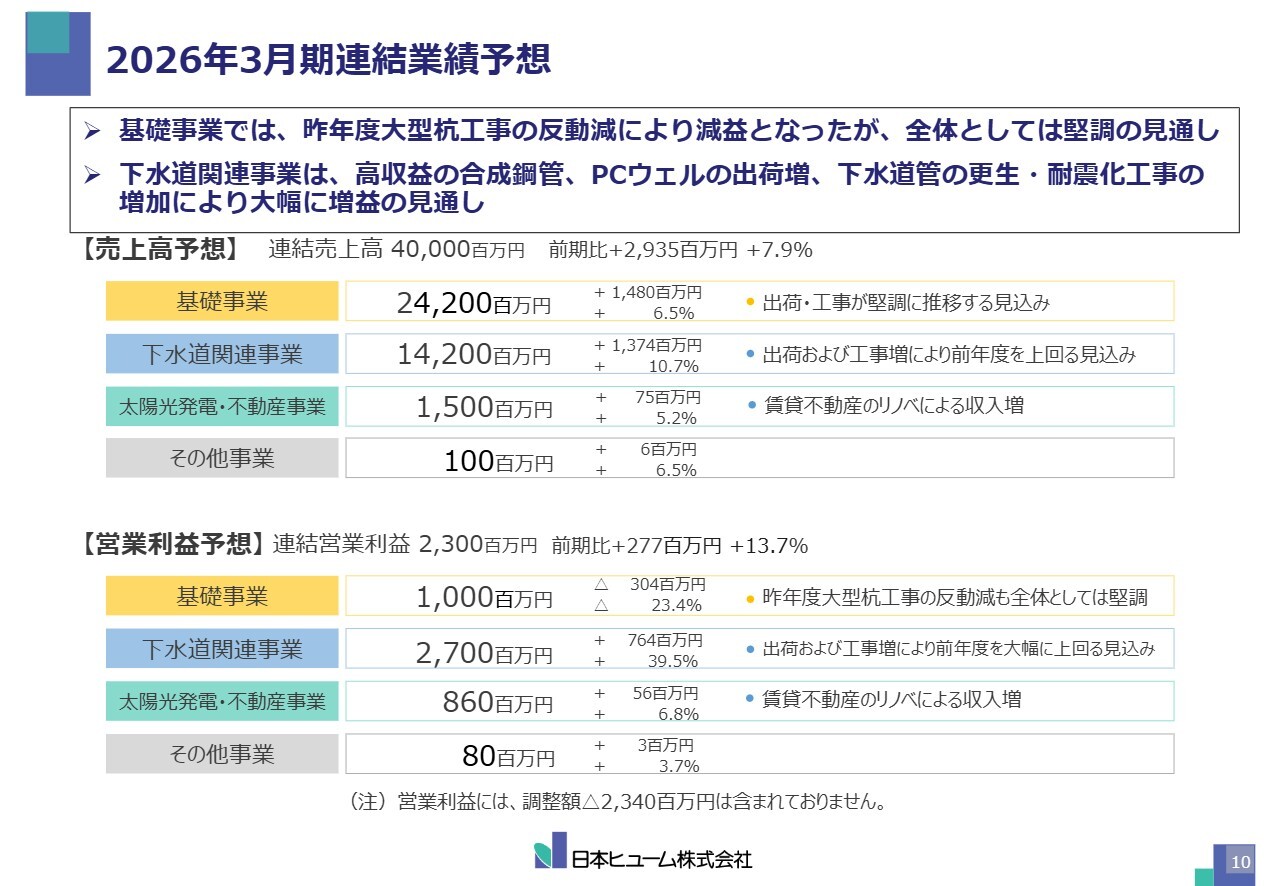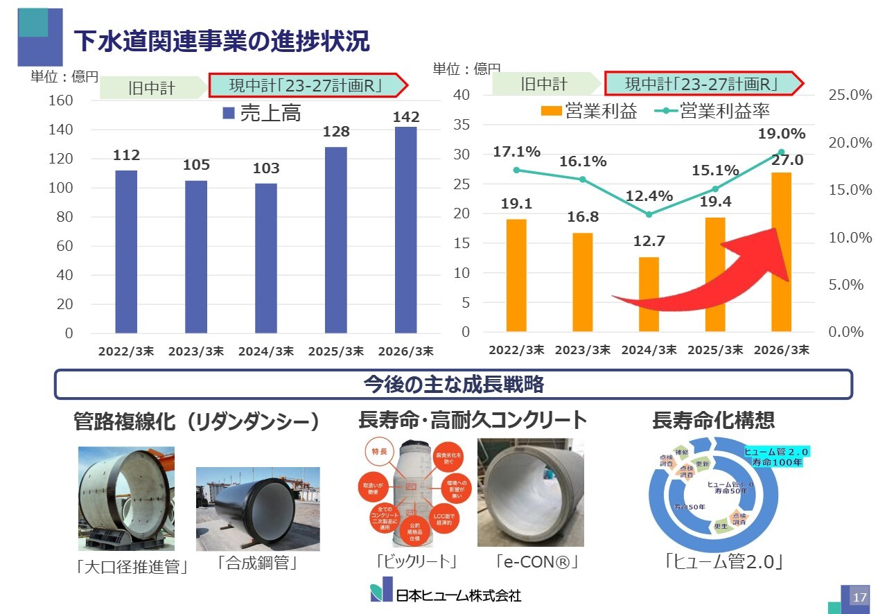 さらに、橋梁の基礎構造物に使用される当社オリジナル製品「PCウェル」の出荷が伸びるほか、下水道管の更生・耐震化工事の需要拡大も寄与する見込みです。