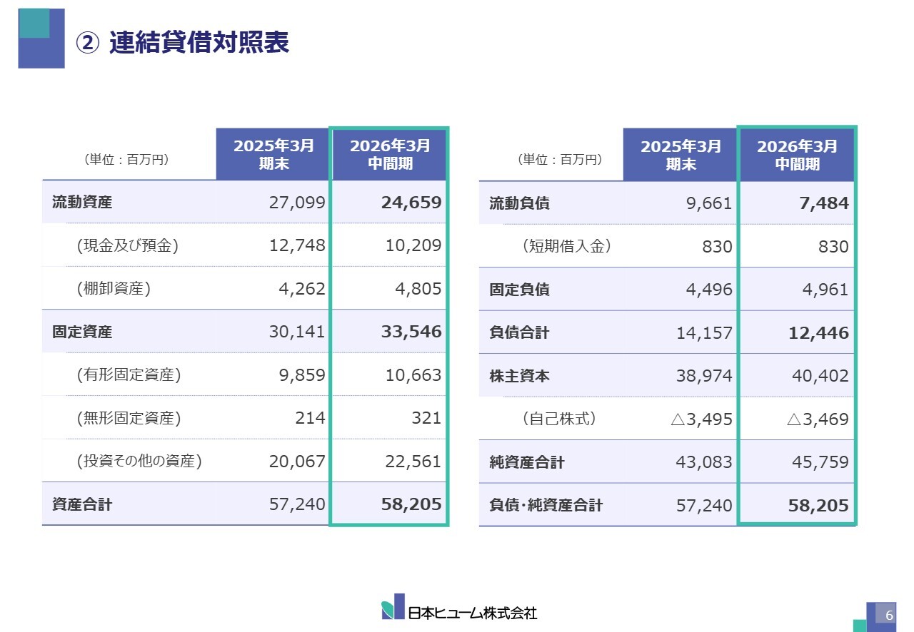 現金および預金は前期末に比べて減少していますが、これは手形廃止および支払サイトの短縮に伴う一時的な資金流出によるものです。