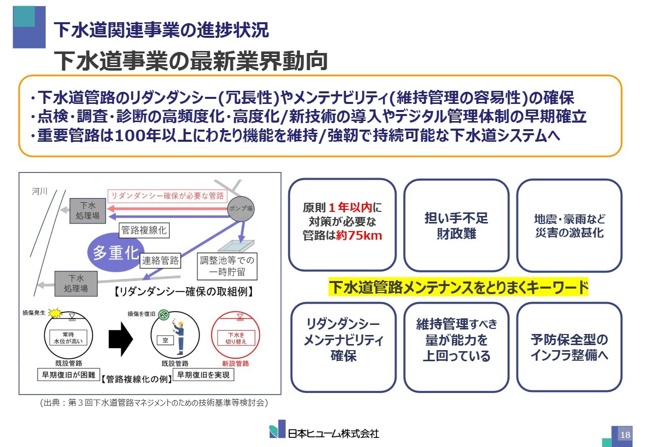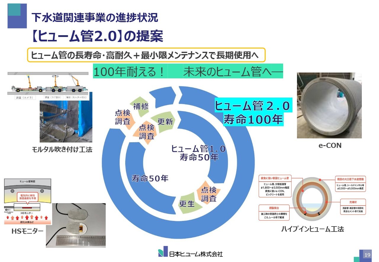 一般的に、ヒューム管は耐用年数が約50年とされており、当社ではこれを「ヒューム管1.0」と位置づけています。今後、すでに埋設されている既設管の更新需要が本格化する見通しです。