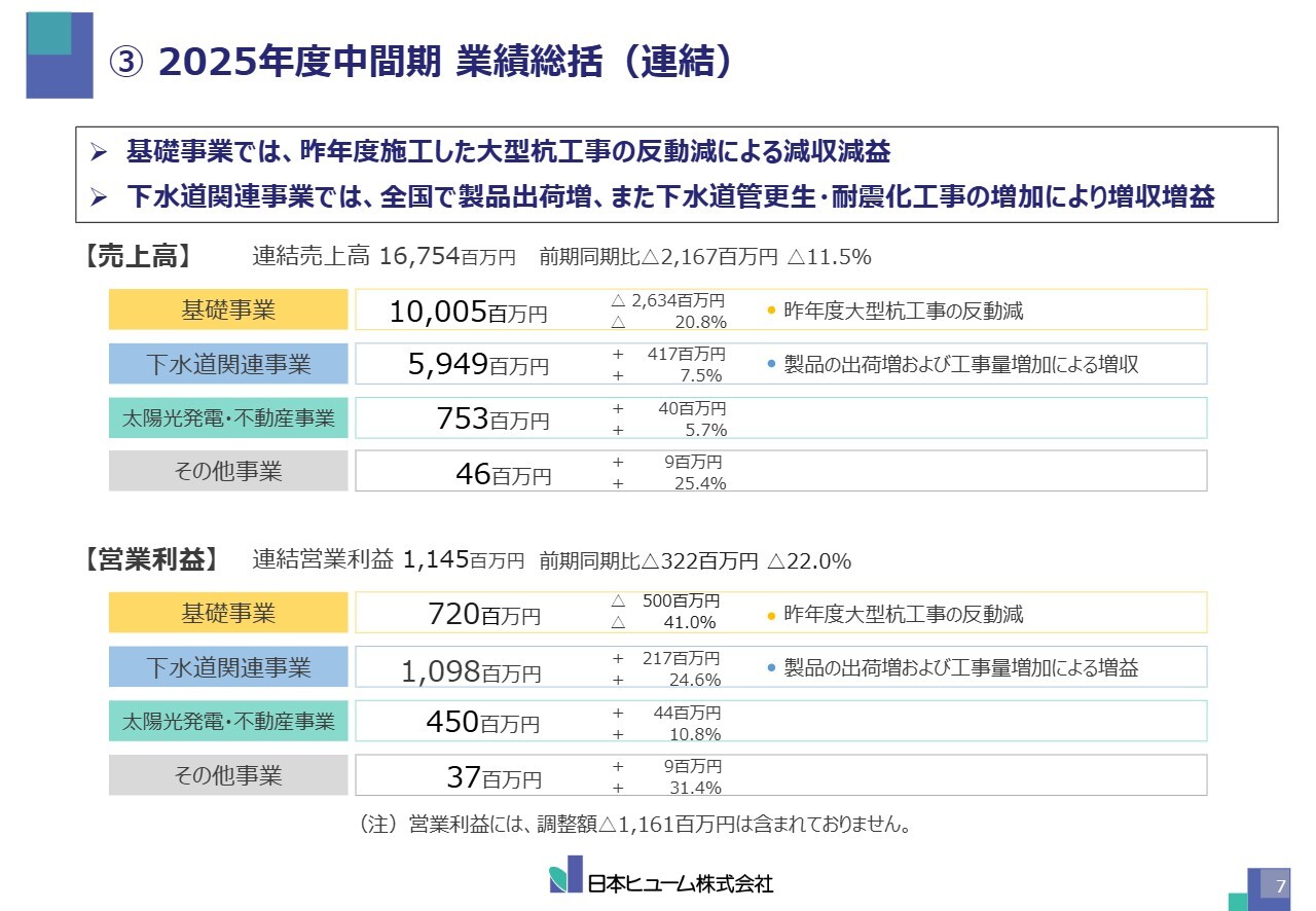 基礎事業については、昨年度に施工した大型杭工事の反動減により、売上高は約100億円で前年同期比20.8パーセント減、営業利益は7億2,000万円で前年同期比41.0パーセント減となりました。