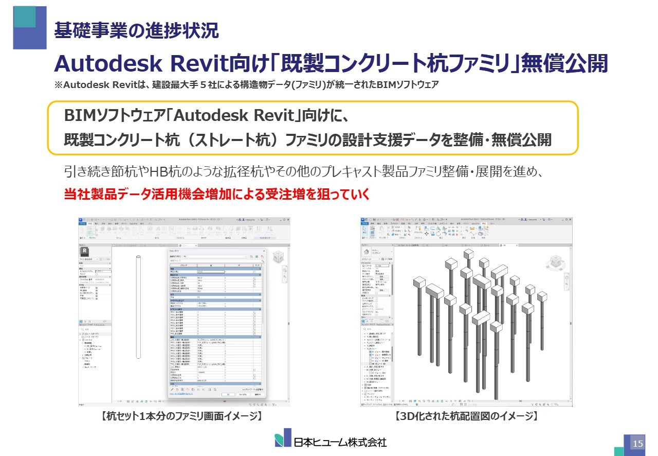 今期の基礎事業における主なトピックスをご紹介します。当社では、BIMソフトウェア「Autodesk Revit」向けに、既製コンクリート杭の設計支援データを整備し、無償で公開しました。
