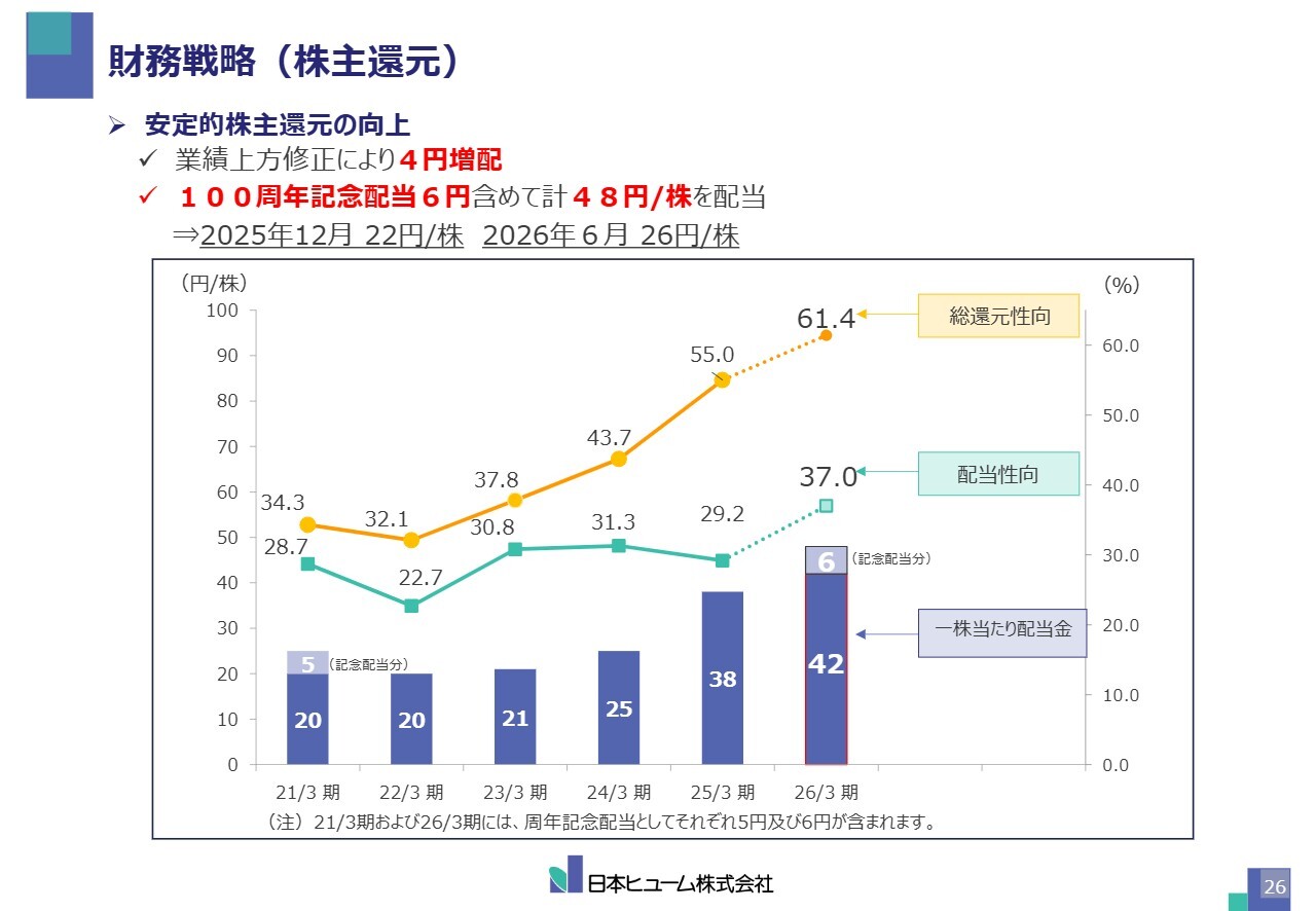 今期は、業績の上方修正を踏まえ、株式分割を考慮しないベースで4円増配し、48円とします。この金額には記念配当6円を含めています。100周年という節目の年に、これまでのご支援への感謝の気持ちを込めた配当です。