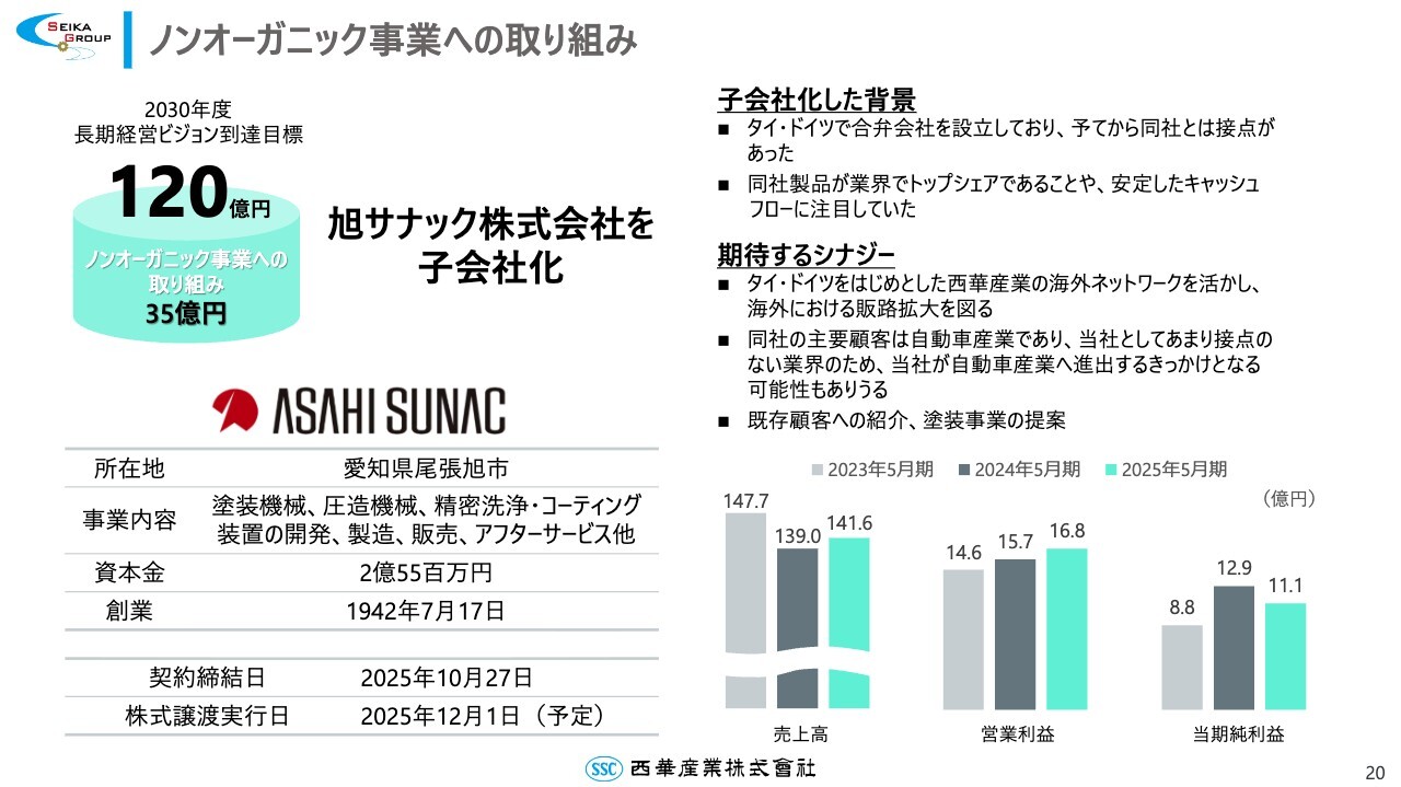 かねてより合弁先・取引先として協力してきましたが、今回の子会社化を契機に、タイやドイツをはじめとした海外での販売拡大を図り、シナジーを発揮していきます。なお、旭サナックの株式譲渡実行日は、本年12月1日の予定です。