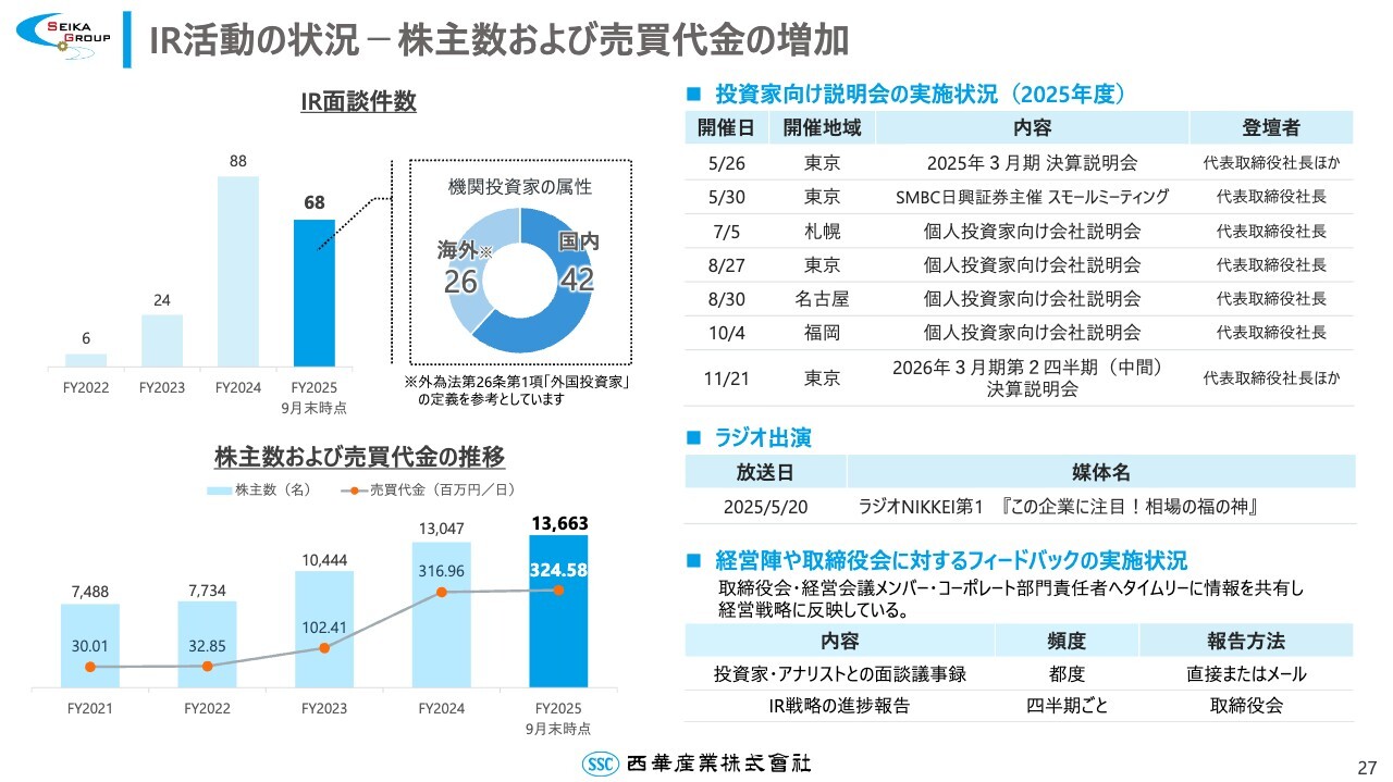 今年度のIR面談件数は、9月末時点で合計68件と、前年度を大きく上回るペースで取材依頼をいただいています。面談でいただいたコメントは、取締役会や経営会議メンバーとタイムリーに情報を共有し、経営戦略に反映しています。
