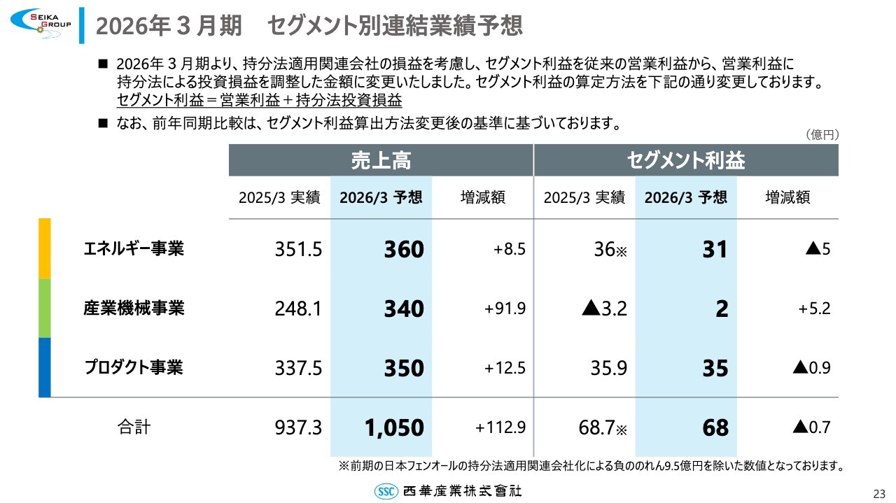 連結業績予想と同様に、セグメント別予想についても期首予想からの修正はありません。セグメント利益の算出方法は、今期、2026年3月期より、従来の営業利益に加えて持分法投資損益を含めたものに変更しています。