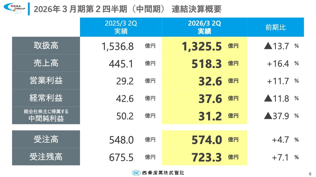 はじめに2026年3月期第2四半期の決算サマリーです。取扱高は1,325億5,000万円、売上高は518億3,000万円、営業利益は32億6,000万円、中間純利益は31億2,000万円となりました。