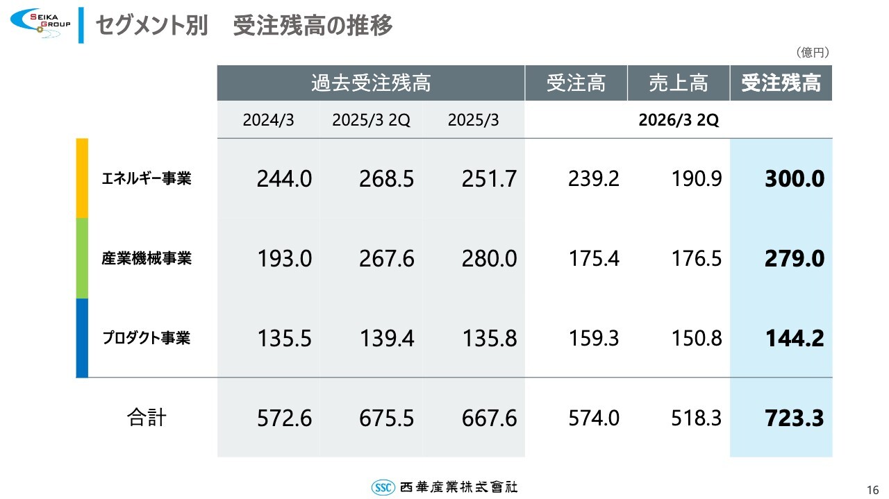 セグメント別の受注残高については、表のとおりです。産業機械事業の受注残高は大型案件の受け渡しが進んだ影響で前期末より1億円ほど減少していますが、全体としては前年同期比31.9パーセントの増加、前期末比8.3パーセントの増加と、着実に増加傾向を示しています。