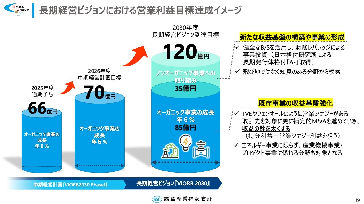 この目標はエネルギー、産業機械、プロダクトなど、オーガニック事業の年6パーセントの成長率によって達成可能と考えています。また、長期経営ビジョンの最終年度となる2030年度には、今期の66億円から約2倍の120億円を目標としています。