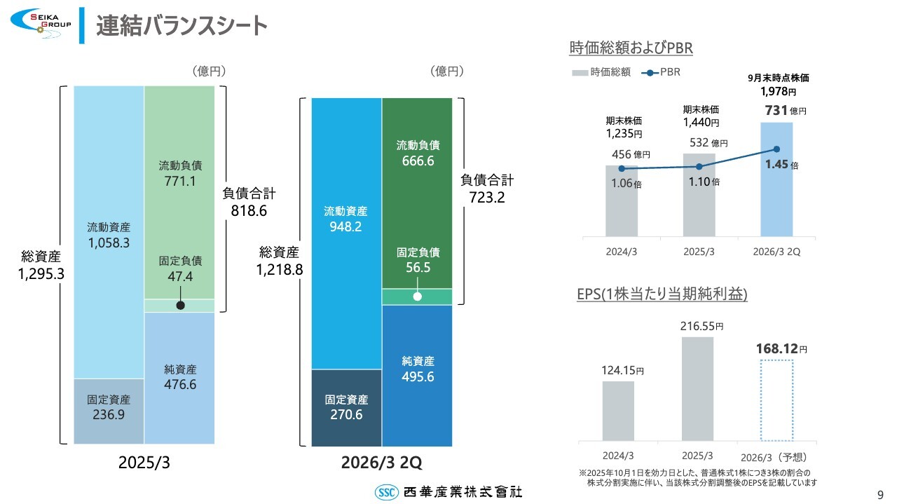 連結バランスシートです。9⽉末時点の時価総額は731億円、PBRは1.45倍となり、ともにこの6ヶ月で⼤幅に上昇しました。EPSについては、10⽉1⽇付けの株式分割を考慮した数値を記載しています。