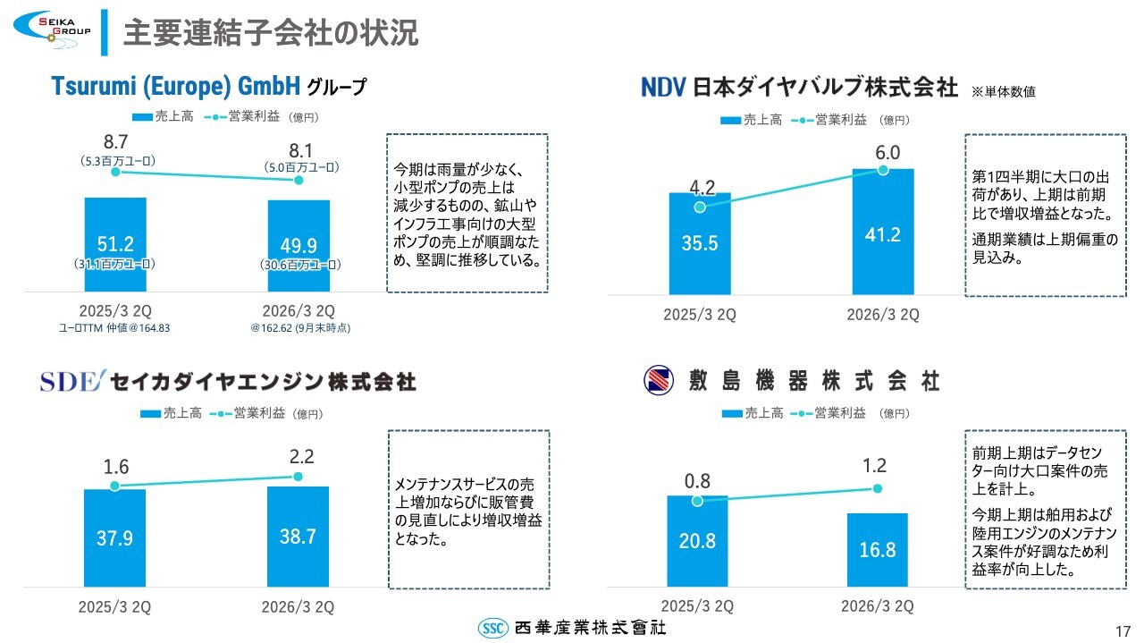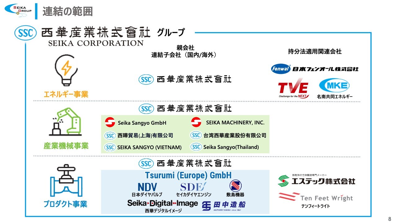 連結の範囲はスライドの図のとおりです。収益の柱となるグループ企業は、Tsurumi (Europe) GmbH、⽇本ダイヤバルブ、セイカダイヤエンジン、敷島機器の4社です。