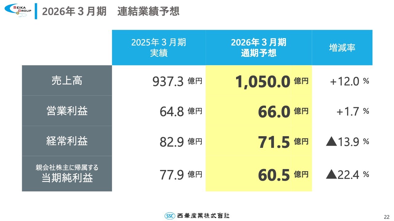 今期の連結業績予想についてです。期首予想からの修正はなく、売上高は1,050億円、営業利益は66億円、経常利益は71億5,000万円、親会社株主に帰属する当期純利益は60億5,000万円と予想しています。