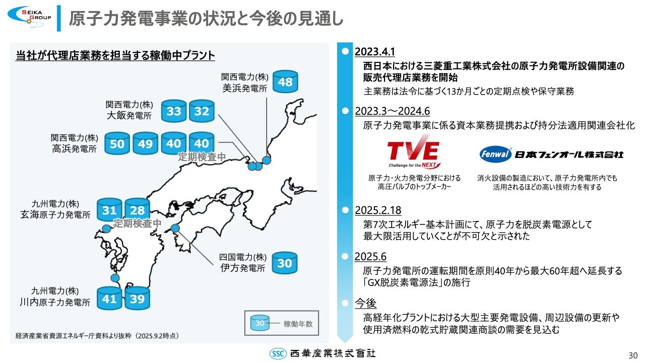 2023年度より開始した原子力発電事業の状況と今後の見通しについてです。当社の三菱重工業代理店業務を担当する稼働中のプラントは、図のとおりです。主な業務は、法令に基づく13ヶ月ごとの定期点検や保守業務です。
