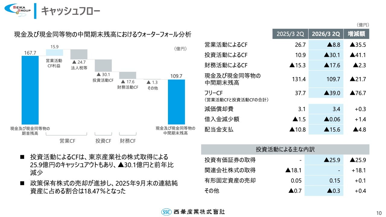 キャッシュフローについてご説明します。投資活動によるキャッシュフローは、本年4⽉に実施した東京産業株式会社の株式取得によるキャッシュアウトもあり、マイナス30億1,000万円となりました。なお、政策保有株式の連結純資産に占める割合は、⽬標としている20パーセント未満の⽔準を維持しています。