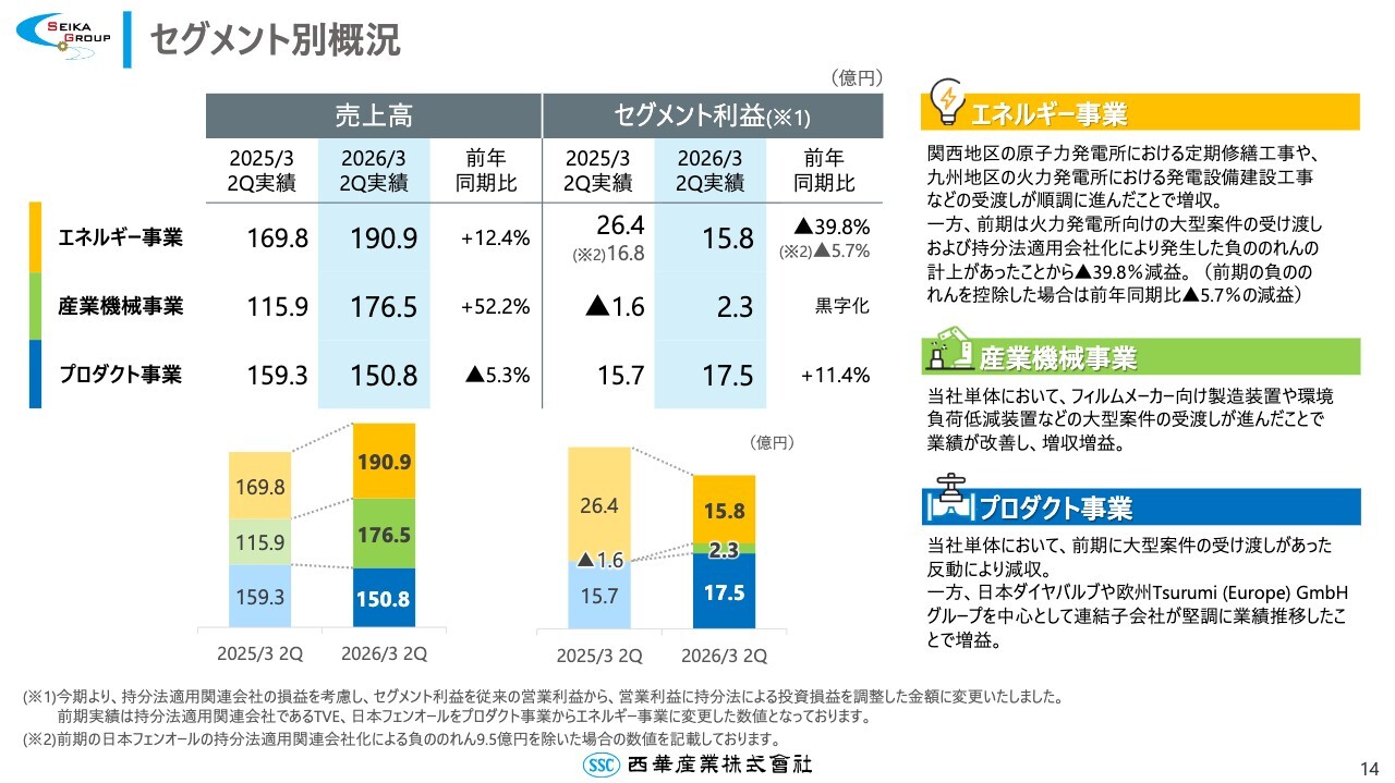 続いて、セグメント別の概況です。実績および各セグメントの状況はスライドにあるとおりです。