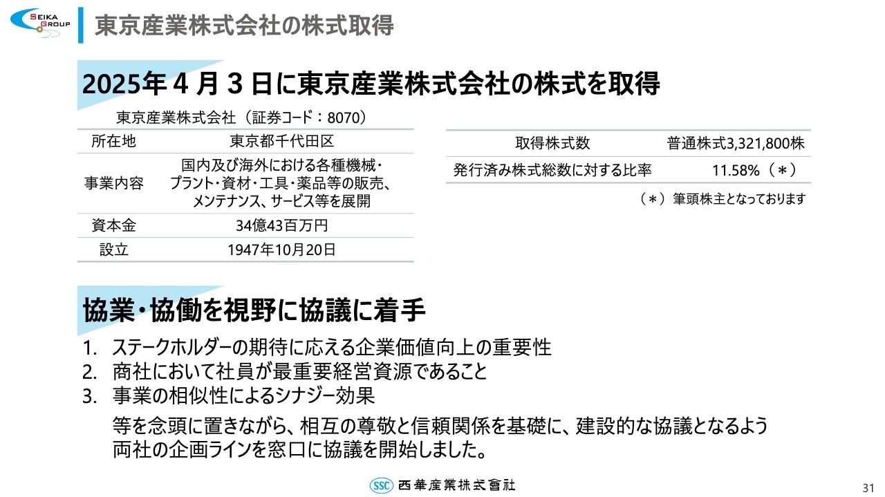 本年4月に株式を取得した東京産業株式会社との状況についてご報告します。