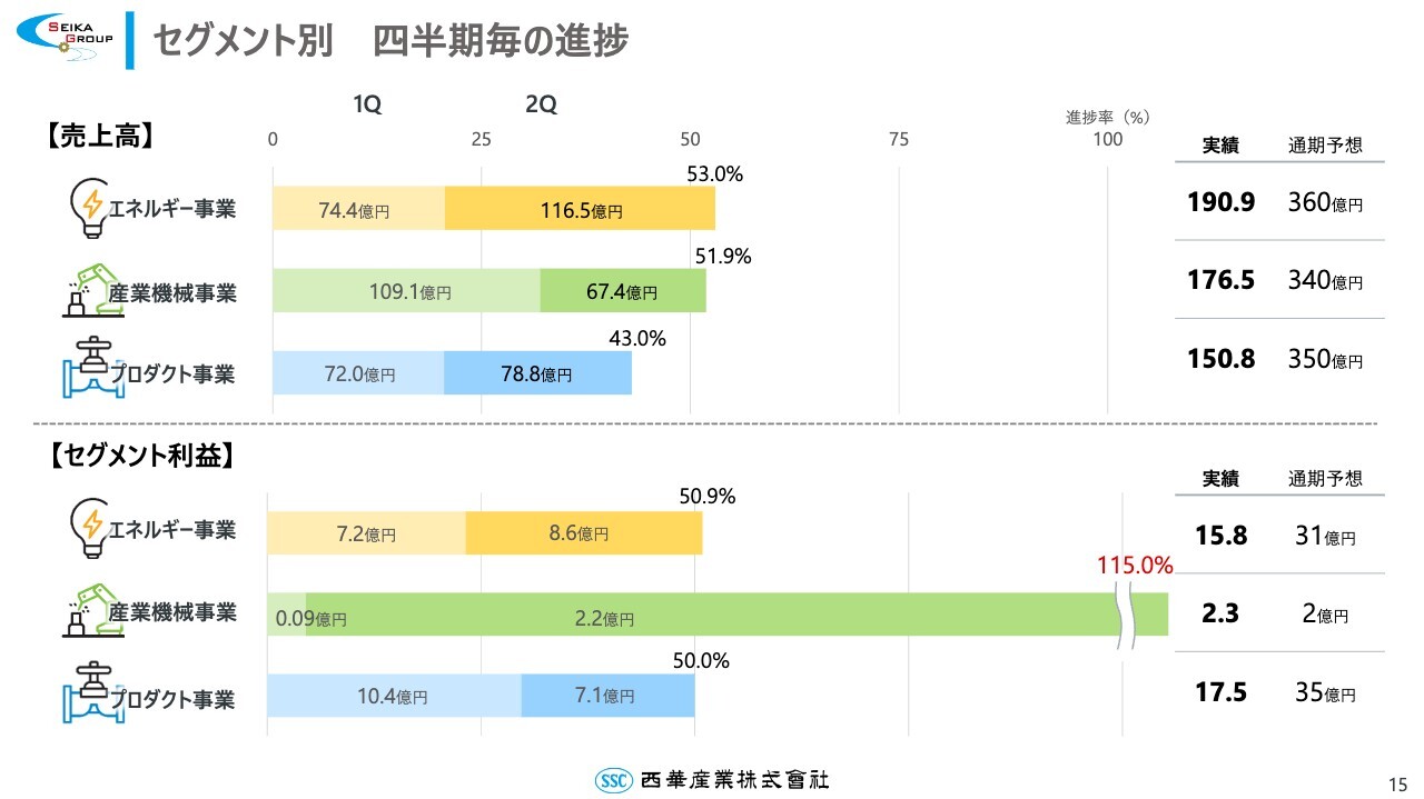 セグメント別の売上高、およびセグメント利益の進捗です。産業機械事業のセグメント利益については、第2四半期ですでに通期予想を達成したため、現在、通期見通しを精査中です。