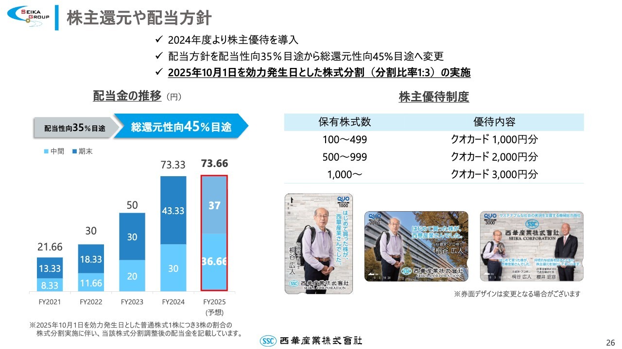 配当⾦について、当社は10⽉1⽇付けで分割割合1:3の株式分割を実施しており、期末配当は37円を予想しています。