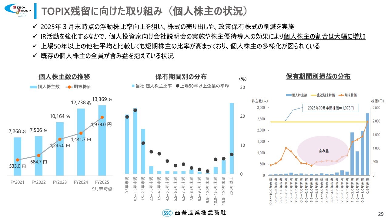 スライド右側のグラフは保有期間別の損益の分布を示しており、すべての既存個人株主さまが含み益を抱えている状況ではないかと考えられます。TOPIX残留の基準日である来年8月に向けて、気を緩めることなく、売買代金回転率および浮動株時価総額の上昇に取り組んでいきます。