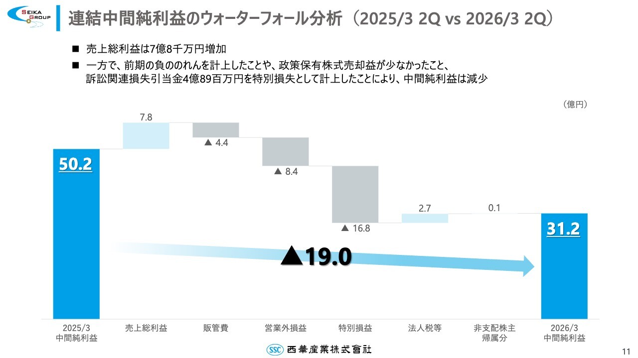 連結純利益における前期比のウォーターフォール分析です。売上総利益は7億8,000万円増加したものの、前期の負ののれんを計上したことの反動や、今期の政策保有株式売却益が少なかったこと、訴訟関連損失引当⾦の4億8,900万円を特別損失として計上したことにより、中間純利益は前年同期⽐で19億円減少しました。