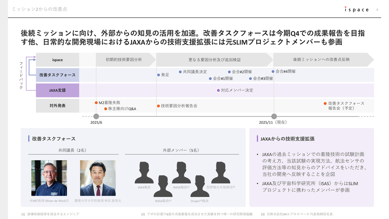 また、当社独自の改善策に加え、外部有識者を巻き込んだより広範な強化策である「改善タスクフォース」とJAXAからの技術支援の拡張についても、順調に進捗しています。