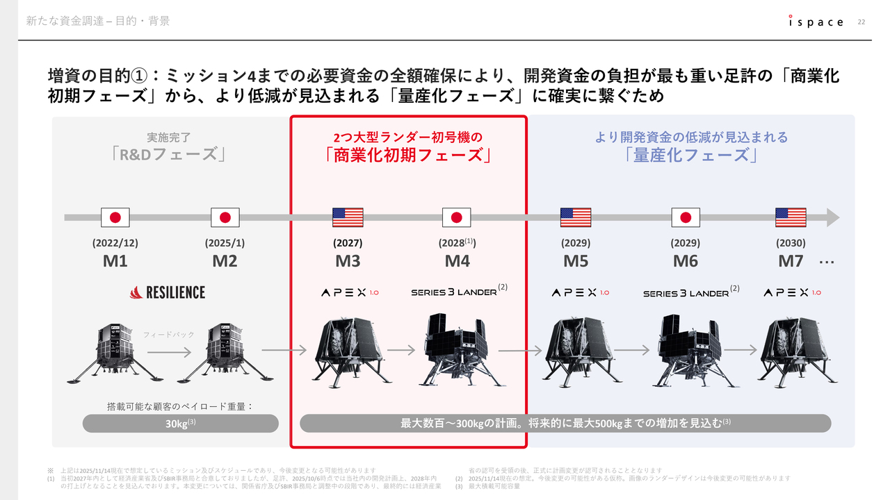 今回の増資により、Mission 4までの必要資金を全額確保し、Mission 5やMission 6など、本格的な「量産化フェーズ」に向かう道筋を確実にすることが可能となります。