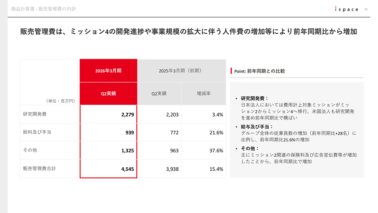 つまり、昨年よりも開発が進捗し、それに伴い売上が増加しています。ちなみに、今後はMission 3だけではなく、先ほどのTASAや東京科学大学のMission 4の売上も増加していきます。そのため、下期にはさらに売上の増加を目指していきたいと考えています。以上が、売上についてです。